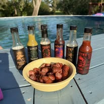 Apple cider vinegar, fire-roasted red bell peppers, tomatoes, water, onion, garlic, 7 Pot Primo peppers, habanero peppers, balsamic vinegar, maple syrup, black garlic, lime juice, smoked paprika, chipotle peppers in adobo, thyme, kosher salt.
